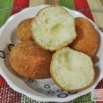 Once the temperature is right, place the buñuelo balls in the oil, and let them fry. The buñuelos will turn over on their own, once they stop and are golden, remove and drain. And done.