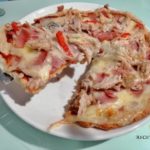Take it out and add the chosen ingredients, tomato paste, the rest of mozzarella cheese, ham, chicken, paprika, and sprinkle the oregano.